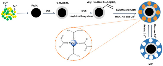 The preparation of magnetic cadmium ion-imprinted polymer is schematically shown in Figure 1. Briefly, 0.5 mmol of CdCl2·5/2H2O, 1.5 mmol of methacrylic acid, and 0.5 mmol of acrylamide were dispersed into a mixture solution of acetonitrile (40 mL) and water (10 mL) under stirring at room temperature for 90 min. Then 0.5 g of vinyl-modified Fe3O4@SiO2, 1.98 g of ethylene glycol dimethacrylate and 0.15 g of azodiisobutyronitrile were added consecutively. The polymerization reaction was performed at 85 °C with 10 h of stirring to obtain particles with a highly crosslinked structure. The product was separated with an external magnetic force, washed with ethanol, and oven-dried at 65 °C for 6 h. The template was removed by 2.0 M of HCl. For comparison, magnetic non-imprinted polymer (MNIP) was also prepared using an identical procedure in the absence of the template (cadmium ions).