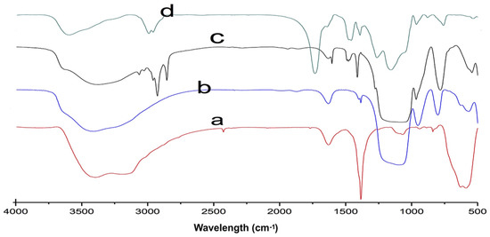 The infrared spectra of Fe3O4, Fe3O4@SiO2, Fe3O4@SiO2–C=C, and MIIP are displayed in Figure 2. The adsorption peak at 589 cm−1 observed in all samples can be assigned to Fe–O stretching vibrations, which indicated the presence of Fe3O4. These peaks intensity diminished as ion-imprinted polymer was layered onto Fe3O4 [29]. The peaks of Fe3O4@SiO2 at 1100, 953, and 801 cm−1 corresponded to the Si–O–Si, Si–O–H, and Si–O stretching, respectively, and indicated that the silica was modified onto the surface of Fe3O4 successfully. The peaks at 1603, 3063, and 3026 cm−1 coming from C=C stretching suggested that the vinyl groups were grafted onto the surface of Fe3O4@SiO2. The peak of MIIP at 1732 cm−1 was the characteristic group frequencies of the C=O stretching vibration, and the appearance of the stretching vibrations at 1263 cm−1 belonging to C–N–H indicated that methacrylic acid and acrylamide were both involved in the imprinted polymerization.