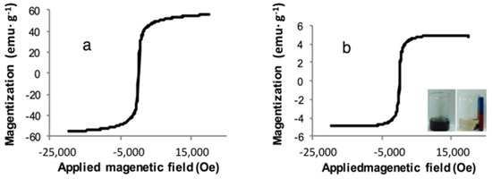 The magnetic hysteresis loops of Fe3O4 and MIIP are illustrated in Figure 4. The two loops showed similar shapes and coercive force, which indicated that both of them were superparamagnetic in nature. The saturation magnetization of Fe3O4 was 55.6 emu·g−1. In comparison, the MIIP showed a lower saturation magnetization, which was 4.88 emu·g−1, suggesting the formation of the polymer layer on the surface of Fe3O4@SiO2. Therefore, the magnetic separation of MIIP can be achieved with an external magnetic force.