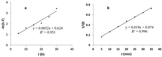 where Qe is the equilibrium adsorption capacity (mg·g−1), Ce is the equilibrium concentration, Kf and n are the Freundlich constants related to the adsorption capacity and intensity, respectively, Qmax represents the maximum adsorption capacity, and Kb is the Langmuir constant representing the affinity between the solute and adsorbent. To further understand the mechanism of the adsorption process, two different kinetic models (Laguerre pseudo-first-order and pseudo-second-order kinetic models) were used to fit the kinetic data. The two kinetic models for the adsorption of solid/liquid system are as follows [26,27]: