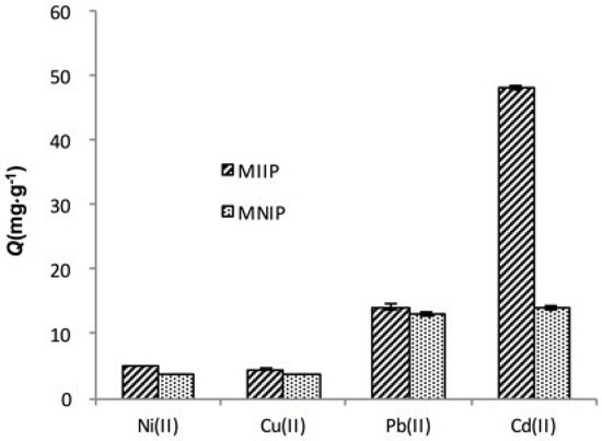 The adsorption capacities of Cd(II), Pb(II), Cu(II), and Ni(II) onto the MIIP and MNIP.