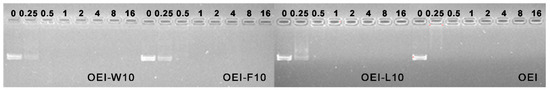 The primary requirement for polymeric gene vectors is the ability to bind and condense plasmid DNA. Agarose gel retardation assay was first used to estimate the DNA-binding ability of these polycations. As shown in Figure 1, the studied OEI-AAs could completely retard DNA migration at a small polymer/DNA weight ratio (w/w) of 0.5. On the other hand, this w/w was slightly larger than the cases using OEI or PEI 25 kDa (Figure S1), suggesting that the surface modification of OEI might have negative steric effect on the interaction with DNA. However, subsequent experiments revealed that the transfection efficiency could be largely improved by the modification, indicating that excessively strong DNA binding might hinder the DNA release and gene transfection. The ethidium bromide (EB) exclusion experiment gave consistent results (Figure S2). All the tested materials could efficiently displace EB that previously intercalated into DNA base pairs, leading to fluorescence quenching. Unmodified OEI and PEI could quench the fluorescence of EB more quickly than the modified forms, but the difference was small. OEI-W and OEI-F had slightly better binding ability than OEI-L, indicating that the aromatic rings might facilitate their interaction with DNA. To examine the special property of aromatic rings toward DNA binding, we also studied the fluorescence change of OEI-W before and after its interaction with DNA. Results show that the fluorescence intensity of OEI-W10 at 354 nm (the characteristic peak corresponding to the tryptophan residues) gradually lowered with the increase in the amount of DNA (decrease of w/w, Figure S3), suggesting that the aromatic indole rings of tryptophan might intercalate into the DNA base pairs, leading to distinct fluorescence change [37]. On the contrary, a similar phenomenon was not observed for OEI-F10, which has aromatic phenyl rings in the structure. Thus, it was believed that the indole ring may play special role in the interaction with DNA. Further, heparin was used to study the release of DNA from the polyplexes. It was found that DNA could be gradually released with the increasing amount of heparin (Figure S4). Similar to the above results, since OEI has a higher DNA-binding ability than the modified forms, more heparin was needed to release the DNA from the polyplex formed from OEI.