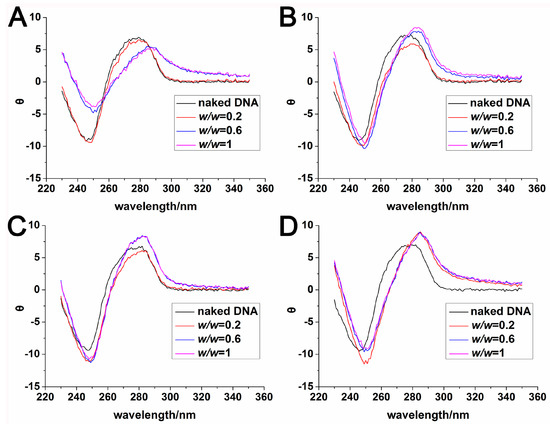 CD spectra of DNA/polycations ((A) OEI-W10; (B) OEI-F10; (C) OEI-L10; (D) OEI) with different w/w ratios.