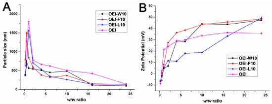 Particle size (A) and zeta potential (B) of polyplexes obtained at different weight ratios by DLS. Data represent mean ± SD (n = 3).