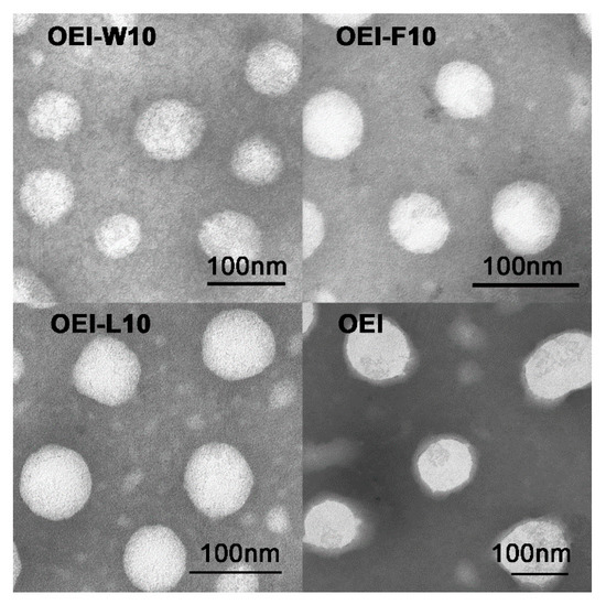The morphologies of the polyplexes were observed by TEM (Hitachi High-Tech Science, Schaumburg, IL, USA) with an acceleration voltage of 100 kV. A total of 4 µg of pUC-19 was added to the appropriate volume of the polymer solution (weight ratio of polymer relative to pDNA, w/w = 16:1 for OEI-W10&OEI-L10 and w/w = 24:1 for OEI-F10&OEI), and incubated at 37 °C for 0.5 h. Then the polyplex solution was diluted to the total volume of 200 µL. A drop of DNA/polymer polyplex suspension was placed onto the copper grid. After a few minutes, the excess solution was blotted away with filter paper. Then, a drop of 0.5% (w/v) phosphotungstic acid was placed on the above grid. The grid was dried at room temperature at atmospheric pressure for several minutes before observation.
