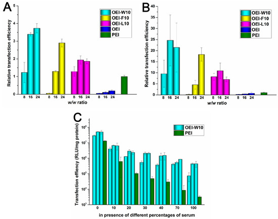 Luciferase gene expression transfected by polyplexes at different weight ratios ((A,B) Relative TE by normalizing the TE of PEI (w/w = 1.4) as 1; (C) absolute TE) in HeLa cells. Data represent mean ± SD (n = 3). (A) Without serum; (B) With the presence of 10% serum; (C) Effect of serum concentration on the TE (weight ratio for OEI-W10: 8, 16 and 24).
