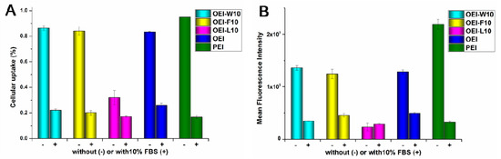 To investigate the gene transfection efficiency of OEI-AAs, the luciferase reporter gene pGL-3 plasmid was first used to quantitatively assess their in vitro TE in HEK293 cells. Figure 5 shows the transfection results, which were described as relative TE by normalizing the TE of PEI (w/w = 1.4, N/P = 10) as 1. It is well known that low molecular weight PEI (e.g., OEI) is less toxic than its higher molecular weight counterpart such as PEI 25 kDa, but its TE is lower. This was demonstrated by the experiments, in which OEI indeed showed much lower TE. On the contrary, to our delight, the modification of OEI with amino acids was able to greatly improve the TE, which was even higher than that of PEI 25 kDa. OEI modified by tryptophan exhibited the best transfection results, and the TE reached levels up to ten times higher than PEI (OEI-W10). The modification with phenylalanine or leucine was also able to enhance the TE of OEI, but to a lesser extent. The optimal TE of OEI-F and OEI-L were similar to PEI. On the other hand, results also show that OEI-AAs with an SD of 10% are more suitable for transfection. Further, the transfection experiments were also carried out in serum circumstances to estimate the serum tolerance of the materials (Figure 5B). With the presence of 10% serum, the OEIs modified by the amino acids containing aromatic rings were able to give much higher relative TE than those without serum, especially for OEI-W10, which gave 96 times higher TE than PEI. We speculate that the excellent serum tolerance might come from their good DNA condensation ability, making the polyplex more stable.