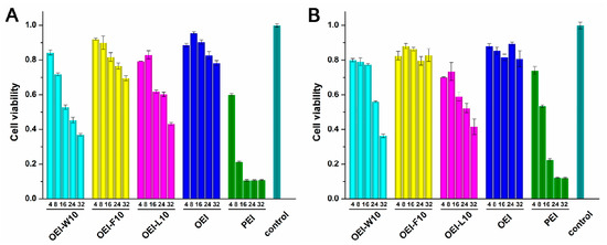 Nucleic acids are attractive compounds for modulating cell function with high precision [1,2]. Since naked nucleic acids may be easily degraded by nuclease, and the structure of negatively charged phosphates restrict the uptake into cells. Thus, safe and efficient gene delivery vectors are urgently needed [3,4,5,6]. Compared with viral vectors, polycations show lower immunogenicity and a high nucleic acid loading capacity, and they can be easily prepared and their chemical structures may be conveniently modified, exhibiting potential for the construction of ideal non-viral gene delivery systems [7,8,9,10]. Among the “off-the-shelf” polycations, polyethylenimine (PEI) has been regarded as the benchmark for newly designed non-viral polycationic vectors for its high condensation capability toward DNA, strong buffering capacity, and relatively high gene transfection efficiency (TE) [11,12,13]. However, like other polycations for gene delivery, PEI also faces several extracellular and intracellular barriers such as serum stability, cellular uptake, endosomal escape, and nuclear localization [14,15]. The major limitations for its application include the following: firstly, high molecular weight (HMW) PEI (such as 25 kDa) has high TE but considerable toxicity and limited biocompatibility, whereas low molecular weight (LMW) PEI has low toxicity but poor TE [16,17]. It was found that PEI with a molecular weight <2 kDa exhibited almost no in vitro cytotoxicity and low TE even at high concentrations [18,19]. Secondly, PEI has a weak serum tolerance ability, which is necessary for in vivo application [20]. Modification of PEI with some functional groups may overcome specific gene delivery barriers and improve the TE [21,22]. For example, hydrophobic modification of PEI could improve the interaction between the vector–DNA complex (polyplex) and the cell membrane and lead to more efficient cellular uptake [23]. The introduction of negatively charged moieties such as carboxylic acids and phenolic hydroxyls may reduce cytotoxicity while improving the TE [11,24]. Besides, the surface positive charge of PEI could be shielded by a biocompatible polyethyleneglycol (PEG) structure, resulting in an elongated circulation time, reduced cytotoxicity and improved serum tolerance [25,26,27,28]. However, the introduction of negatively charged moieties or PEG may shield the positive charge of PEI and hinder their DNA condensation and cellular uptake ability [29].