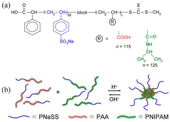 It is known that hydrogen bonding interactions between amide groups or poly(ethylene glycol) (PEG) and carboxylic acid groups promote self-association or complex formation in water [,,]. Shieh et al. [] prepared a series of poly(N-isopropylacrylamide-random-acrylic acid) (P(NIPAM–r–AA)) copolymers and examined their glass transition behavior. They found that the incorporation of acrylic acid units into the PNIPAM polymer enhances the glass transition temperature (Tg) due to intermolecular hydrogen bonding between the pendant isopropyl amide groups and the carboxylic acid groups using 1H NMR and Fourier-transform infrared analyses. As an example of such complex formation, Bian et al. [] investigated the interaction between poly(N,N-diethylacrylamide) (PDEA), which is an analog of PNIPAM, and poly(acrylic acid) (PAA). The complex is formed between the two polymers through hydrogen bonding interactions with a stoichiometry of r = 0.6 (r is the unit molar ratio of PAA/PDEA), and the complex formation depends on pH values. We lately reported [] the complex formation behavior of poly(sodium stylenesulfonate)–block–PEG–block–poly(sodium stylenesulfonate) (PNaSS–b–PEG–b–PNaSS) with poly(methacrylic acid) (PMA). Both PNaSS–b–PEG–b–PNaSS and PMA were synthesized via reversible addition–fragmentation chain transfer (RAFT) radical polymerization. Below pH 5, water-soluble complexes were formed owing to the hydrogen bonding interactions between the PEG block in PNaSS–b–PEG–b–PNaSS and the carboxylic acids in PMA. The experimental data indicated that the PNaSS–b–PEG–b–PNaSS/PMA complex was spherical in shape. At pH greater than 5, the complex dissociated because the hydrogen bonding interaction disappeared due to deprotonation of the pendant carboxylic acids in PMA.