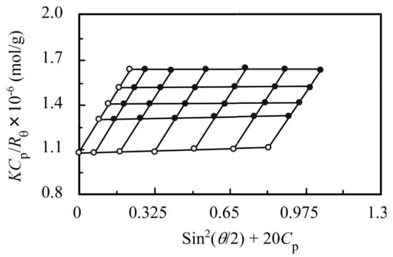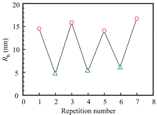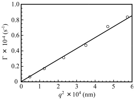 The relaxation rates (Γ) measured at different scattering angles (θ) are plotted as a function of the square of the magnitude of the scattering vector (q2) for the mixture of PNaSS58–b–PAA125 and PNaSS58–b–PNIPAM115 in 0.1 M NaCl at pH 3 in Figure 5. A linear plot passing through the origin suggests that the relaxation modes are virtually diffusive []. Thus, the Rh values can be estimated at a fixed θ of 90° as the angular dependence is negligible.