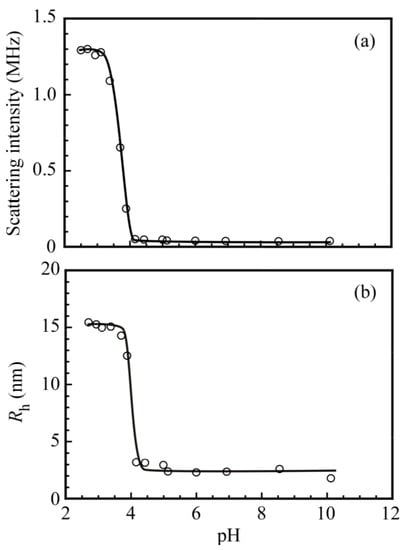 Figure 9a shows the light scattering intensities for the complex of PNaSS58–b–PAA125 and PNaSS58–b–PNIPAM115 in 0.1 M NaCl as a function of pH. The light scattering intensity increased rapidly as the pH decreased from 4.0 to 3.5, which suggests that the complex was formed below pH 3.5. The light scattering intensity was nearly constant between pH 3.5 and 2.5 suggests that Nagg was constant in this pH region because the light scattering intensity is proportional to the molecular mass. Figure 9b shows Rh values for the complex as a function of pH. Above pH 4.0, the Rh values were of the order of 3 nm, suggesting that PNaSS58–b–PAA125 and PNaSS58–b–PNIPAM115 were in a unimer state. As the pH decreased, Rh started to increase at around pH 4.0, reaching a maximum value of 15.0 nm at pH 3.5. As the pH continued to decrease, Rh was nearly constant between pH 3.5 and 2.5, suggesting that not the aggregation number but the compactness of the complex was practically constant.