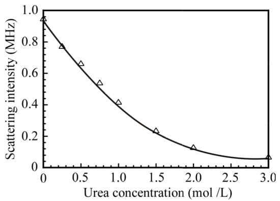 To confirm the formation of the PNaSS58–b–PAA125/PNaSS58–b–PNIPAM115 complex via hydrogen bonding interactions, urea was added to the mixture of PNaSS58–b–PAA125 and PNaSS58–b–PNIPAM115 in 0.1 M NaCl at pH 3. It is known that urea disturbs hydrogen bonding interactions []. Figure 11 shows the light scattering intensity for the PNaSS58–b–PAA125/PNaSS58–b–PNIPAM115 complex as a function of the concentration of urea. The light scattering intensity decreased as the concentration of urea increased from 0 to 3.0 mol/L, and the scattering intensity dropped below 0.1 MHz at 3.0 mol/L urea concentration. These observations are indicative of the complete dissociation of the complex caused by an excess amount of urea. Thus, the complex was confirmed to be formed via hydrogen bonding interactions.