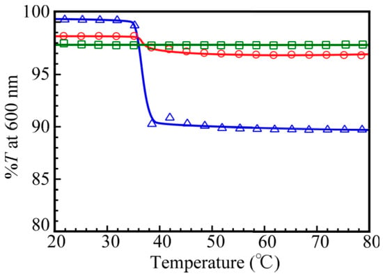 The NIPAM block in the PNaSS58–b–PNIPAM115 diblock copolymer dissolves in water at room temperature, but it separates from aqueous solutions when heated above the lower critical solution temperature (LCST). Figure 12 shows the percent transmittance (%T) values monitored at 600 nm for 0.1 M NaCl aqueous solutions of PNaSS58–b–PNIPAM115 and a mixture of PNaSS58–b–PAA125 and PNaSS58–b–PNIPAM115 at pH 3 and 10, as a function of solution temperature. The diblock copolymer, PNaSS58–b–PNIPAM115, exhibited a significant %T change at 35–37 °C, which indicates the LCST. The mixture at pH 10 also exhibited a slight %T change at 35–37 °C. On the other hand, the mixture at pH 3 did not show any %T change in the temperature range from 20 to 80 °C. Ordinarily, the mechanism of LCST for PNIPAM can be explained as follows [,]. Below LCST, the PNIPAM chains are hydrated because the pendant amide groups form hydrogen bonding with water molecules, whereas above LCST, molecular motions prevail over the hydrogen bonding interactions resulting in the dehydration of the PNIPAM chains, thus leading to phase separation. Therefore, the PNIPAM chains dehydrated causing phase separation. In the case of the PNaSS58–b–PAA125/PNaSS58–b–PNIPAM115 complex at pH 3, the pendant amide groups in the PNIPAM block interact with the pendant carboxylic acid in the PAA block irrespective of the temperature. Hence, the pendant amide groups in the PNIPAM block are prevented from forming hydrogen bonds with water molecules. Therefore, the LCST of the complex at pH 3 cannot be observed. However, at pH 10, the mixture dissociated and hydrogen bonding interactions between the pendant amide groups in PNaSS58–b–PNIPAM115 and water molecules were formed at low temperature. Hence, the LCST can be observed for the mixture of PNaSS58–b–PAA125 and PNaSS58–b–PNIPAM115 at pH 10, although the decrease in %T at the LCST was small comparing to the PNaSS58–b–PNIPAM115 case. This is simply because the concentration of the NIPAM units in the former solution is lower than that in the latter solution.