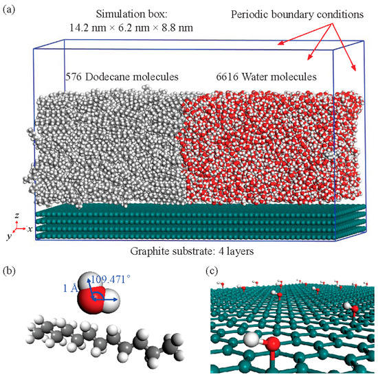 Our MD simulations are implemented through the Forcite module in the Material Studio software (California, CA, USA). We adopt the dodecane (C12) to simulate the oil molecules. The simulation system contains 576 C12 and 6616 H2O of the SPC/E model, which is initially configured in a 16.5 nm × 7 nm × 5.7 nm simulation box. The initial 100 ps simulation allows the system to reach temperature equilibrium in a canonical (NVT) ensemble. Subsequently, the fluid is applied in an isothermal-isobaric (NPT) ensemble, and the system reaches stability in another 120 ps. The system box finally achieves a volume of 14.2 nm × 6 nm × 4.9 nm with a density of 0.871 g cm−3 at 1 atm and 298 K. We then arrange the final structure on a piece of 14.2 nm × 6.2 nm four-layer smooth graphite to simulate the solid surface, as shown in Figure 1a. Here, we use a smooth graphite surface, since a rough one would weaken its interaction with water molecules, thus making the surface more hydrophobic. The structures of the oil and water molecules are shown in Figure 1b. For the hydroxylated graphite system, hydroxyls are arranged uniformly on the first layer of the graphite surface to modify the graphite [20]. Figure 1c shows the local configuration of the hydroxylated graphite surface. For different hydroxyl densities, different distances between the hydroxyls are arranged. In this paper, we adopt seven different densities, ranging from 0 to 4.53 nm−2. Graphite atoms are fixed during the simulation, while hydroxyl groups can swing on the surface. Periodic boundary conditions are adopted in all directions. A vacant layer with a thickness of 0.2 nm is settled to ensure that the substrate has a weak effect on the fluid from the top side, as shown in Figure 1a. A 100 ps simulation using the Andersen thermostatic condition is then carried out in the NVT ensemble at 298 K to study the properties of the three-phase contact zone in the two systems. The time step is 1 fs. To improve the computational efficiency, only the neighboring atoms within a certain cutoff radius (rcut) of 1.2 nm are included in the force calculation, since the distant atoms have a negligible contribution. The long-range Coulombic interactions are handled with the three-dimensional Ewald summation.