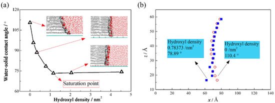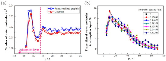 To illustrate the mechanism of the effect of the hydroxyls, the z-direction position of water molecules is obtained for gaining adsorption status. An example of 69 hydroxyls is analyzed as a typical case (hydroxylated graphite in Figure 3a). The distribution of water molecules along the z-direction is obtained by dividing the simulation region into bins, each Δz = 0.5 Å in size, and the z coordinate is stored for H2O in the bins. Then, we can obtain the number of water molecules in each bin and calculate the number of water molecules per Å2. For the calculation of the area of each bin, we apply the degree of contact angle that was obtained in Figure 2.