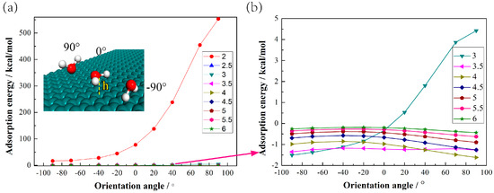 To reveal the reason for the orientation property of H2O molecules near the surface, adsorption energy of an H2O molecule with different θ absorbed on 4-layer graphite is calculated. Here, we consider several different distances between the H2O molecule and the graphite surface. The adsorption energy is calculated by the following equation: