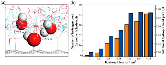 Details of hydrogen bonds formed between hydroxyls and water molecules. (a) Microscopic view of hydrogen bond formed between hydroxyls and water molecules; (b) Number of hydrogen bonds formed by hydroxyls (orange histogram) and additional hydrogen bonds per water molecule in adsorption layer (blue histogram).