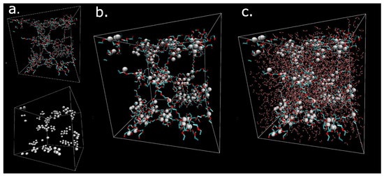 The macromolecular network is visualized in Figure 1 by means of VMD software (Theoretical and Computational Biophysics Group, University of Illinois at Urbana-Champaign, Urbana, IL, USA) [26]. The dry hydrogel network consists of components: network (Figure 1a, up) and physical crosslinks (Figure 1a, down). The addition of both components (network and physical clusters) creates the model of the dry hydrogel network (Figure 1b). The next addition of the solvent to the organic phase network result is in the complete hydrogel material structure (Figure 1c). The white clusters are cores of micelles. The cyan-red components are flexible chains composed of hydrophilic poly(ethylene glycol) chains. The small red-white objects in Figure 1c are molecules of water. The distribution and motion of water molecules are key properties, which are analyzed in this article. Figure 1 illustrates a constitution of the model. The secondary structure of the model was created by self-assembly of current size (box size = 5 nm) using molecular dynamics simulation.