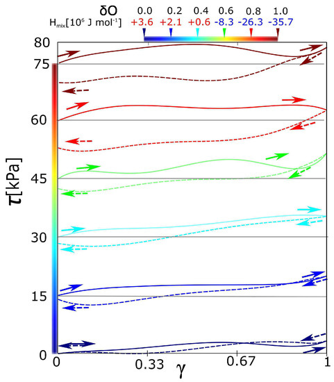 Stress-strain curves of forward-reverse shear deformations for networks with different partial charges. Charges on oxygen from PEG were = 0.0 to −1.0. Solid lines are forward deformation, dash lines are reverse deformation. All curves show the hysteresis. The curves for = from −0.2 to −1.0 were shifted equidistantly along the y-axis for better visibility. (Upper legend is a mixing enthalpy of the individual networks.