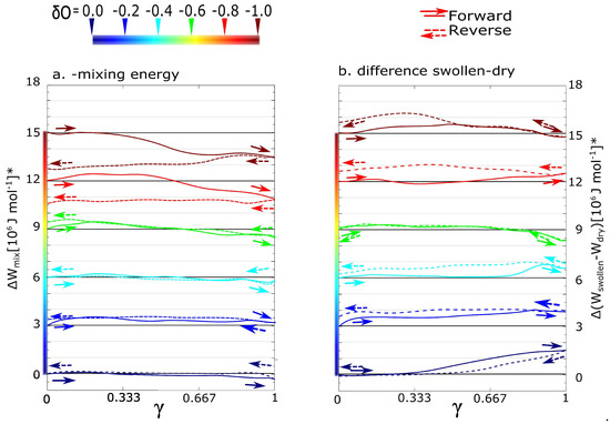Contribution of solvent during forward-reverse shear deformations; (a) the components of mixing energy: The energy of dry network and solvent were separated from the total potential energy of swollen network. The physical meaning is a thermodynamic contribution of mixing energy during deformation; (b) mixing as a difference of two simulations: Swollen and dry networks. The physical meaning is the influence of water on the evolution of the network.
