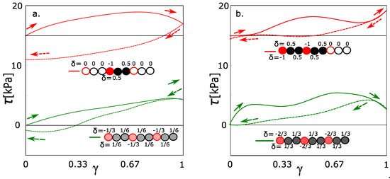 Analogously, the same pair was modeled for average charge density −2/3 per one monomeric unit. From the green line in Figure 4b, the hysteresis is observed at the average charge density −0.667. In the special case, two monomeric units with a partial charge of −1.0 were alternating with one uncharged monomeric unit. The hysteresis was observed as well; however, we observed the decrease of hysteresis. It was a slightly unexpected result, which was reconfirmed by repeated simulations. For comparison, we would like to highlight that the deformation is not a monotonous function. It runs in waves (also the functions in Figure 2). Each wave means that we reached the actual limit stress of physical network and the physical network is relaxed. The limit stress for every network in this article is approximately 5 kPa. From this aspect, the red curve in Figure 4b behaves similarly like any other function from this article. The deviation from the normal course of functions is caused probably by a dynamic character of behavior. The increased stress on the physical crosslinks can lead to quicker relaxation.