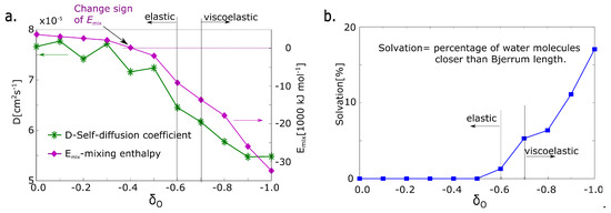 A correlation with mixing energy was investigated. The absolute value of mixing enthalpy is not in correlation with deformation response. The positive mixing energy means destabilization of system by solvent. The negative enthalpy means the stabilization. The switch from the positive and negative mixing enthalpy is observed in the range from −0.4 to −0.6. Another case is a course of mixing energy during deformation Figure 3, which has two alternatives a and b. The case a means thermodynamic stabilization of network, where the deformation energy of hydrogel is compared to partial energies of dry network and water from the same simulation. The case b means the influence of solvent to the structural evolution of network. The deformation energy of hydrogel is compared to the other simulations: deformation of dry network and deformation of box of water. The low-charge networks in-between = 0.0 and = −0.6 have similar a course of in the case a and b in Figure 3. Both the influences in a and b are almost identical. That means the solvent influences the structural response only by thermodynamic stabilization or destabilization of the network. In the case of high charge = −0.8–1.0, the mixing energy functions are different. Probably, the most significant effect is the stabilization of polymer chains in micelles. Then the unfolding can be observed. The macromolecular network contributes to deformation by dissociation of interacting groups from micelles. Then the re-attachment is relatively difficult and slow. These effects are observed in the swollen state and not in dry networks.