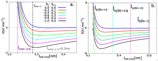 Potential function of the attraction of water to the macromolecular chains as a function of the distance of water from the macromolecular chain and partial charge () on a CH2 group. (a) Results for macroscopic relative permittivity of water ( = 80); (b) results for relative permittivity of water on molecular level ( = 40); The potential energy is the sum of Lennard-Jones potential and electrostatic potential; — Bjerrum length.