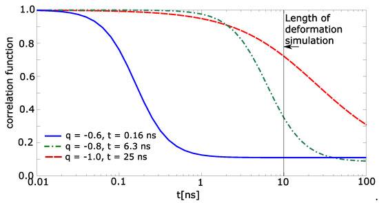 It was found that the relaxation time for the charge −0.6 is 0.16 ns (Figure 7), for charge −0.8 time it is 6.3 ns, and for charge −1.0 the time is 25 ns. Thus, one can conclude that until the charge −0.6, the relaxation time is lower than the time of deformation and above −0.8, the relaxation time is comparable or exceeds the time of deformation. That presumes that the networks with partial charge −0.8 and −1.0 will be viscoelastic, which was really observed in Figure 2.