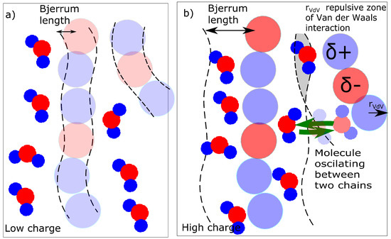 The result is a percentage of water molecules in the solvation zone delimited by Bjerrum length (Equation (3)). We describe the solvation simply as a concentration of molecules that are in the solvation zone of chains as described in Figure 8. If the Bjerrum length is within the repulsive radius of Van der Waals interaction, the water molecules are repulsed. The solvation zone is almost without solvent (Figure 8a). In the case of a high charge, the Bjerrum length is within the attractive zone and the water molecules are stabilized near the chains (Figure 8b). The mechanism of action of the charge was investigated from two aspects. The first aspect is a mixing energy, which can be calculated from the simulations. The first result is a detection of the water molecules in solvation zone of the molecular model (Figure 5b) as a function of partial charge.