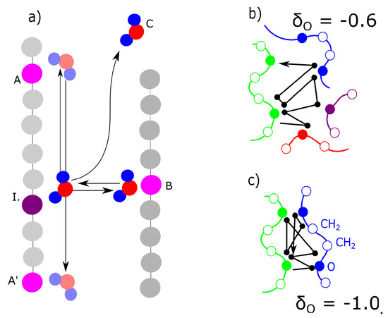 The actual concentration of bridges does not have probably sufficient correlation with deformation response. The bridges are probably dynamic. The criteria for dynamic water bridges are described in Figure 9a. We detected the nearest and second nearest macromolecule for each molecule of water. Some water molecules are present in vicinity of one macromolecule: position (I)—initial position. They switch to the opposite position on the second chain is marked as B. The cases in Figure 9a were compared from the criteria as to how frequently they were observed. The case, when a molecule delayed in an initial position (I), was never observed in any model. The case (C) was observed in general relatively frequently; however, it was excluded from analysis. We selected for analysis only the water molecules which were attached to at least one macromolecule during the entire simulation. Case (A) or (A’) is movement along the chains. Both the networks with a moderate ( = −0.6) and high ( = −1.0) partial charge showed movement along the chains with similar intensity. In both networks movement to a neighbor or second neighbor was observed. In this aspect, we did not observe any difference between the networks with moderate partial charges and those with high partial charges.