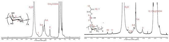 1H NMR collected in 0.4 M CH3COOH/D2O (5 mg/mL) of pure chitosan (left) and CTS–g–GMA (right).