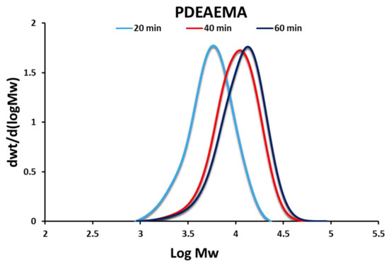 PDEAEMA was synthesized via NMP. A 53% conversion of monomer into polymer was achieved, as determined gravimetrically. The narrow molecular weight distribution (MWD) and evolution of the MWD (Figure 2) indicated a well-controlled living polymerization (the majority of the polymer chains were terminated with SG1, which is required to initiate the grafting to reaction in the subsequent step). The number average molecular weight (Mn) was 9710 g/mol, with a dispersity (D) of 1.37.