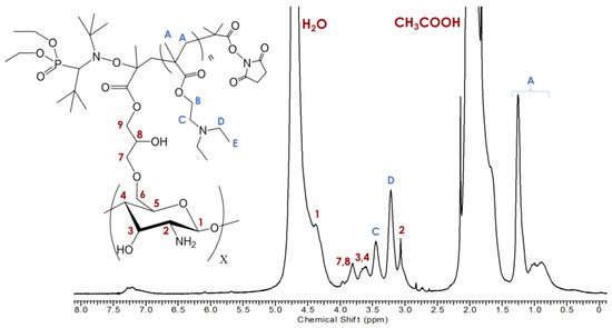 1H NMR collected in 0.4 M CH3COOH/D2O at 5 mg/mL of CTS–g–GMA–PDEAEMA with peak assignments.