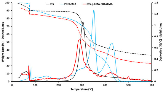 TGA analysis (Figure 4) indicated that decomposition of pure chitosan occurred at 250–350 °C, while decomposition of PDEAEMA occurred in two steps at 320–370 °C, attributed to the decomposition of functional group (diethylaminoethyl) and 390–450 °C attributed to the decomposition of the main backbone chain. CTS–g–GMA–PDEAEMA was found to exhibit two decomposition peaks. The first peak was observed at 250–370 °C and corresponds to the chitosan backbone chain with the broadening of the signal a result of the PDEAEMA peak from 320–370 °C. The second peak noted at 390–450 °C was attributed to presence of grafted PDEAEMA, as this signal was not present for the pure chitosan sample analysis. CTS, PDEAEMA, and CTS–g–GMA–PDEAEMA showed an initial weight loss in the range of 70–100 °C which is attributed to adsorbed water. The combination of characteristic 1H NMR and TGA signals confirmed that PDEAEMA had been successfully grafted to the chitosan.