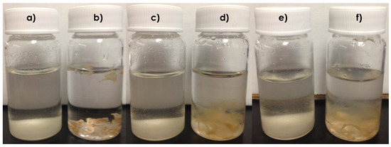 CO2 switchability tests: (a) chitosan in water (pH = 8.74); (b) CTS–g–GMA–PDEAMEA in water (pH = 7.18; (c) chitosan after 1 h of CO2 bubbling (pH = 4.96); (d) CTS–g–GMA–PDEAEMA after 1 h of CO2 bubbling (pH = 5.42); (e) chitosan (pH = 8.12) after 1 h of CO2 bubbling (pH = 5.42), followed by 1 h of air bubbling; (f) CTS–g–GMA–PDEAMEA (pH = 7.32) after 1 h of CO2 bubbling (pH = 5.42), followed by 1 h of air bubbling.