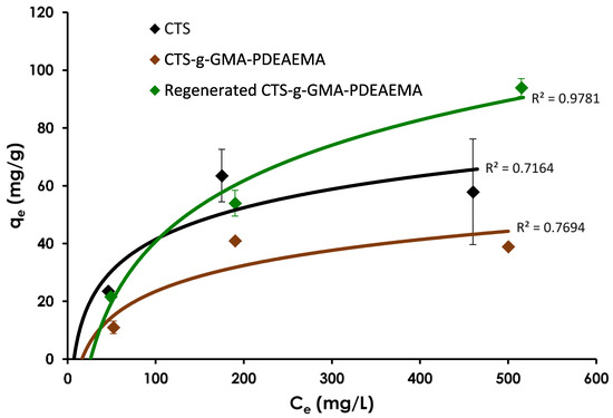 The first Ni(II) adsorption equilibrium study compared the adsorption capacity of chitosan to CTS–g–GMA–PDEAEMA without pH adjustment (i.e., tertiary amine groups were not protonated). It is important to mention that it has been established in the literature that pH plays an important role in the adsorption capacities of different materials [28,29,30,31], however in our particular system, due to the nature of the CO2 (gas) it was not possible to control the pH. These trials (Figure 6) suggested that the initial CTS–g–GMA–PDEAEMA was not as strong an adsorbent as pure chitosan despite the addition of 1.35 PDEAEMA chelation sites for every one chitosan chelation site. This was likely due to the steric bulk of the hydrophobic PDEAEMA polymer chains attached to the chitosan backbone reducing the accessibility to all possible chelation sites. Regeneration of the material with 1 h of CO2 sparging led to the release of 61% (average) of the nickel that had been previously adsorbed on the CTS–g–GMA–PDEAEMA. After regeneration with CO2, the adsorption capacity of the grafted material increased by 196%–241%, surpassing pure chitosan at nickel equilibrium concentrations beyond ~100 mg/L. This could be attributed to the protonation of the amine groups on the PDEAMA chains that would allow for better swelling and dispersion of the CTS–g–GMA–PDEAEMA, thereby facilitating interactions between the nickel ions and the chelation sites. The increase in adsorption capacity after regeneration also suggested that the material was not completely protonated such that all or most of the PDEAEMA chelation sites were unavailable for chelation. The increased adsorption was the motivation for the subsequent trials where the adsorbent materials were initially sparged with CO2 as a “conditioning” step prior to measuring adsorption capacity.