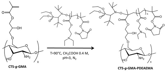 Grafting PDEAEMA to chitosan-grafted PDEAMEA (CTS–g–GMA–PDEAMEA).