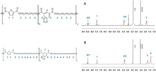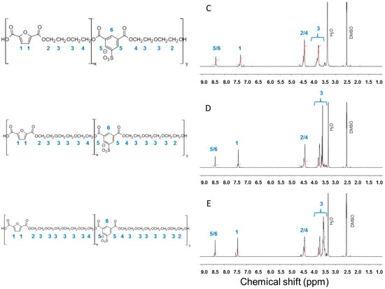 Copolyesters based on 5-sulfoisophthalic acid and 2,5-furandicarboxylic acid with different alkyl and ether diols (Figure 1) were successfully synthesized and their structure confirmed by 1H-NMR (Figure 2). The relative areas of the aromatic proton signals appearing at 8.4 ppm and 7.4 ppm for the 5-sulfoisophthalic acid and 2,5-furandicarboxylic acid units, respectively, were measured to estimate the content of the two aromatic monomers in the copolyesters. The copolyester compositions were found to be essentially the same as the composition used in the reaction feeds (Table 1). The complex signals observed in the 3.4–4.4 ppm region arise from ether diol units contained in the diol counterpart of the copolyester. The results are consistent with already published data on 2,5-furandicarboxylic acid-based polyesters [,,].