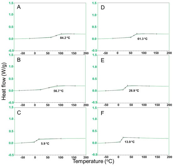DSC thermographs for the glass-transition temperatures of the melted polymer with a cooling rate of 20 K/min for (A) PEFSI, (B) PBFSI, (C) POFSI, (D) PDEFSI, (E) PTEFSI and (F) PTeEFSI in dimethyl sulfoxide.