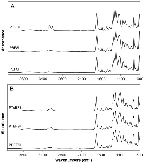 FTIR spectrum of copolyesters based on 5-sulfoisophthalic acid and 2,5-furandicarboxylic acid with altering alkyl (A) and ether (B) with altering polyols, where the codes represent the different alkyl and ether diols in the copolyesters and where PEFSI is 1,2-ethanediol, PBFSI is 1,4-butanediol, POFSI is 1,8-octanediol, PDEFSI is diethylene glycol, PTEFSI is triethylene glycol, and PTeEFSI is tetraethylene glycol.