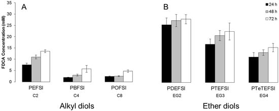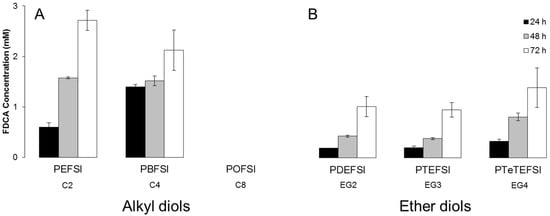 Hydrolytic degradation of copolyesters based on 5-sulfoisophthalic acid and 2,5-furandicarboxylic acid with (A) altering alkyl and (B) ether diols in 100 mM phosphate buffer of pH 7 and 50 °C after 24, 48, and 72 h represented by the amount of released 2,5-furandicarboxylic acid (FDCA). Each bar represents the average of three independent samples; error bars indicate the standard deviation.