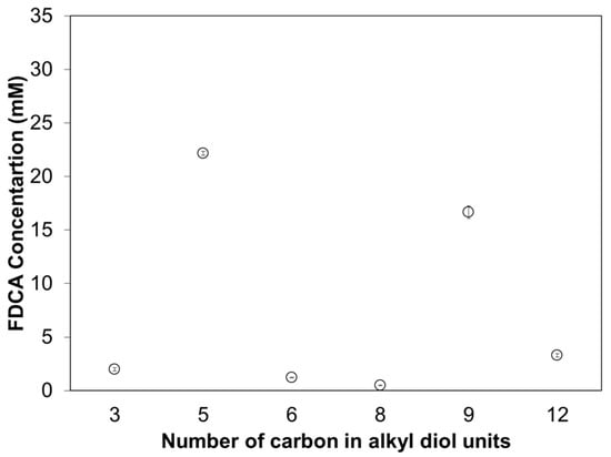 Enzymatic hydrolysis of polyesters consisting of 2,5-furandicarboxylic acid with altering alkyl diols by cutinase 1 from Thermobifida cellulosilytica after 72 h at 50 °C represented by the amount of released FDCA. Each circle represents the average of three independent samples; error bars indicate the standard deviation.