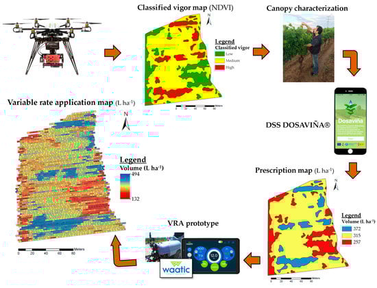 This section presents the entire process carried out to implement the variable application rate in real conditions. This process follows the method of Campos et al. [23] and is summarized in Figure 1. The following steps can be distinguished: (1) Generation of canopy vigor map from UAV data; (2) generation of prescription maps for variable spray application based on canopy maps; (3) development of software and hardware to adapt a conventional sprayer into a Variable Rate Application (VRA) sprayer; and (4) generation of actual application rate map and monitoring of the results.