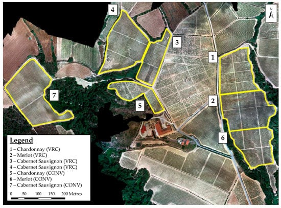 The trials were carried out on the Alt Penedès region (Torrelavid, Barcelona); an important wine production zone in the northeast of Spain. Seven different vineyards were selected, containing three representative varieties: Chardonnay, Merlot and Cabernet Sauvignon (Figure 2).