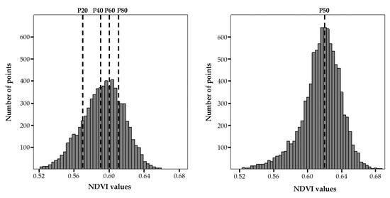 As the vineyards were planted out in rows, the image was segmented by an NDVI threshold in order to eliminate weeds, shadows and soil occurring between rows. In each vigor map building process, different NDVI thresholds were established depending on the response of the not desired pixels (soil, shadows, weeds, etc.). The pixels above the set threshold were considered vineyard pixels and coded as “1”, whereas pixels below the set threshold were considered noise and set to “0”. Once the NDVI threshold was applied, an inverse distance weighting interpolation (IDW) was performed to generate a continuous NDVI map. Final processing consisted of value clustering in three NDVI levels, except in one case, where the clustering process only differentiated two NDVI levels due to the low intra-plot variability (Figure 3). In the case of three NDVI levels, the population were divided in quintiles (P20, P40, P60 and P80). The NDVI values lower than P20 were categorized as low vigor, values between P20 and P80 correspond to medium vigor and values higher than P80 were clustered into high vigor. P20 and P80 were selected as border lines to differentiate low and high vigor canopy zones, avoiding excessive weight to extreme zones. When only two NDVI levels were distinguished, the population were divided with the median (2-quantiles, P50). The NDVI values lower or equal than P50 corresponded to low vigor and those values higher than P50 were categorized as high vigor.