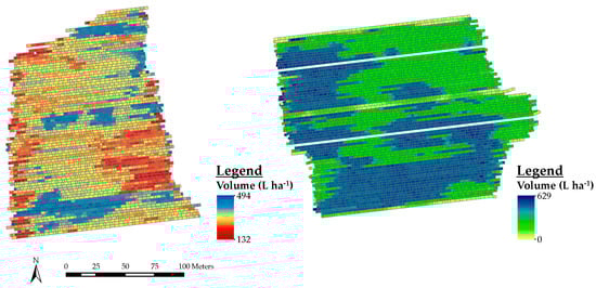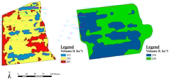 Two of the prescription maps are shown as examples in Figure 6. The left side of the figure presents the prescription map built on June 20th, which corresponds to the 4th spray application of the season on parcel one. In this application, three different volumes of vegetation were determined. In red areas (low vigor), an optimum volume of 257 L ha−1 was determined. In the yellow areas (medium vigor) an optimum volume of 315 L ha−1 was determined, and in the blue areas (high vigor) an application volume of 372 L ha−1. Figure 6 right shows the prescription map built on July 12th, which corresponds to the 6th spray application of the season on parcel two. In this case, only two different vigor categories were differentiated. In green areas (low vigor), the volume rate was 230 L ha−1 and in the blue areas (high vigor), the volume rate was 370 L ha−1.