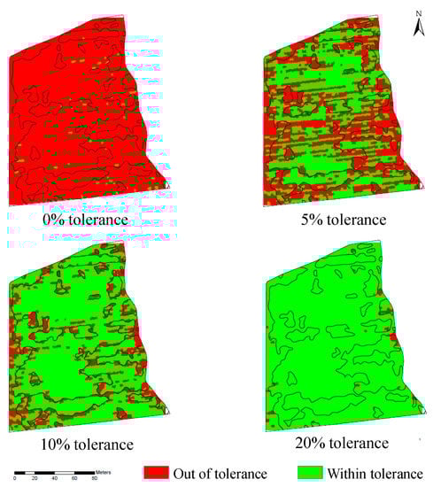 In order to quantify the correspondence between the prescription maps and the actual variable rate application maps, a range of eleven different thresholds were established, from 0% to 50% tolerance. The most restrictive threshold (0%) measured the percentage of points in which there was no difference between the intended and actual application rate. Conversely, the highest tolerance (50%) quantified the percentage of points where variations of ±50% of applied volume were detected.
