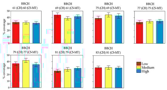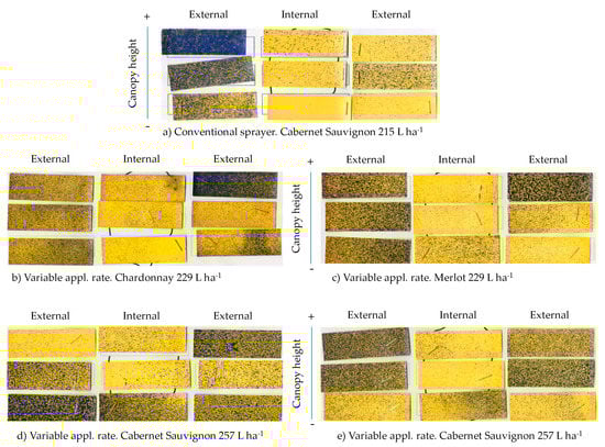 Figure 11 presents the applied volume rates for the conventional and variable rate application systems throughout the whole growing season. In the case of variable rate application, the volume rate was always related to the canopy characteristics. It followed the canopy development and other changes throughout the period, also accounting for vineyard management (pruning and stripping). In contrast, in conventional applications, the volume rate was largely invariable for all spray applications, with the exception being when the farmer detected any disease symptom. In these cases, the applied volume (and consequently the PPP dose) was doubled. This consequently risked losses to the soil, drift and led to difficulties with residue management. A specific example of this was with the Cabernet Sauvignon variety at BBCH 77, where the volume rate was upgraded from 200 to 400 L ha−1. Additionally, the arbitrary increase of volume application rate in conventional mode results in a very poor spray distribution, as it has been shown in Figure 10.