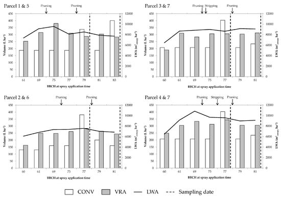 Volume rate applied in conventional and variable rate parcels in each spray application. Time of the evaluation of the biological efficacy (sampling time) as well as pruning and stripping task are marked.