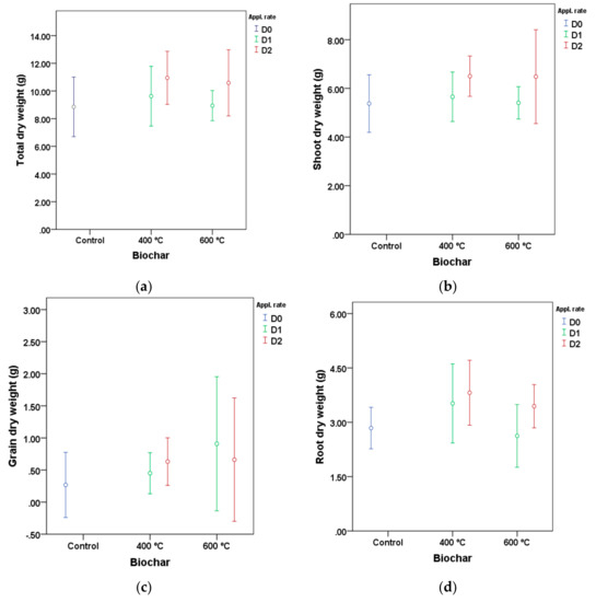Main value and confidence interval at 95% of biomass dry weight on the second cycle of a sorghum crop under different application rates (0 wt. %—D0; 1.5 wt. %—D1; 3 wt. %—D2) of biochar at 400 °C and 600 °C. (a) total dry weight, (b) shoot dry weight, (c) grain dry weight, (d) root dry weight; average values between the sandy-loam growing substrate (S1) and the clay-loam growing substrate (S2).